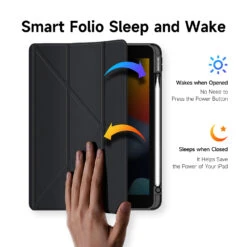 Smart folio offers wake/sleep function, it automatically wakes your tablet when opened and puts it to sleep when closed.