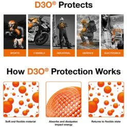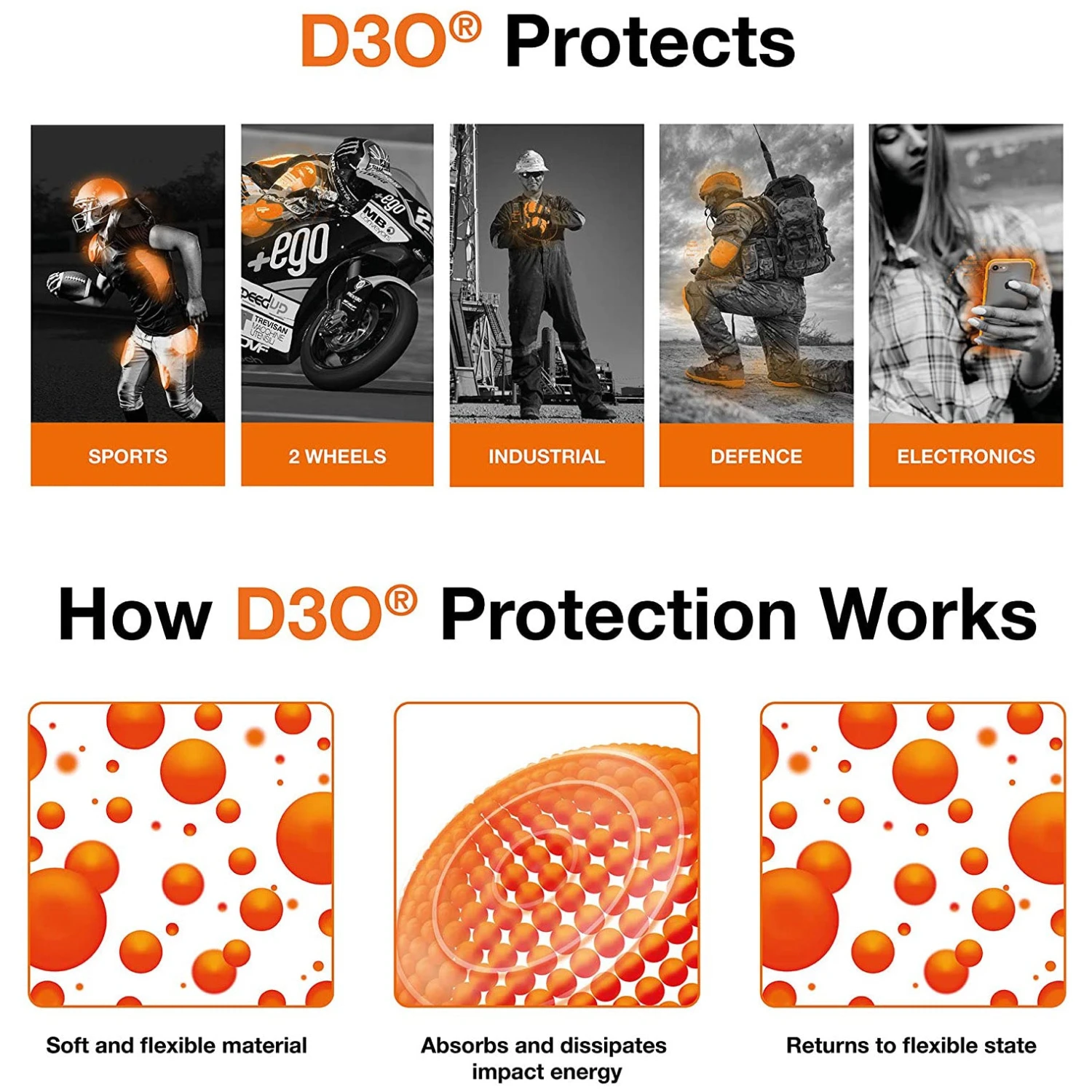 D3O material offers the thinnest and most advanced protection against knocks and drops. It is also used in helmets, gloves and other protective gear used around the world by soldiers, professional athletes, and motorcyclists.