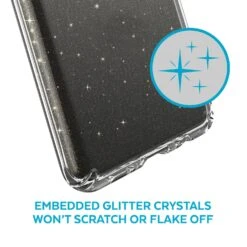 - Presidio® CLEAR + GLITTER is a unique clear case that has bold and shimmering glitter crystals embedded inside two layers of the case, and a high-tech coating that resists fading, scratching, and discoloration.