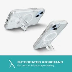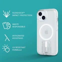 Engineered with our signature FlexShock™ technology, the Evo Crystal Kick in White for iPhone 15 boasts an integrated stand for versatile portrait and landscape viewing and MagSafe® compatibility. Lab-tested to withstand multiple high-impact drops up to 16ft, this case is complete with Enhanced Camera Protection to shield your camera lens from damage.